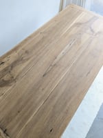 Poncée avec soin, traitée, puis protégée par un vernis mat incolore spécialement conçu pour les cuisines et salles de bains, elle offre une finition à la fois élégante et pratique. Ce type de vernis est pensé pour protéger les surfaces en bois dans des pièces soumises à l’usage quotidien et aux taches, tout en permettant un entretien facile, ce qui est idéal pour une table de repas.