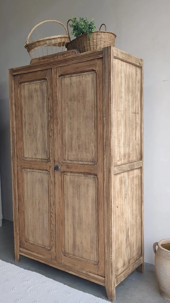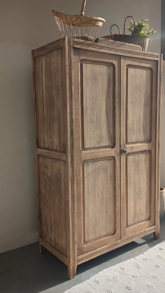 Superbe armoire ancienne en bois massif, restaurée avec une patine naturelle qui met en valeur le veinage authentique du bois. Cette grande armoire de brocante offre un style chaleureux et intemporel, idéal pour une décoration rustique, campagne chic, vintage ou maison de famille.