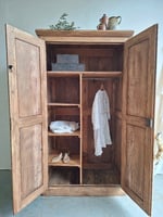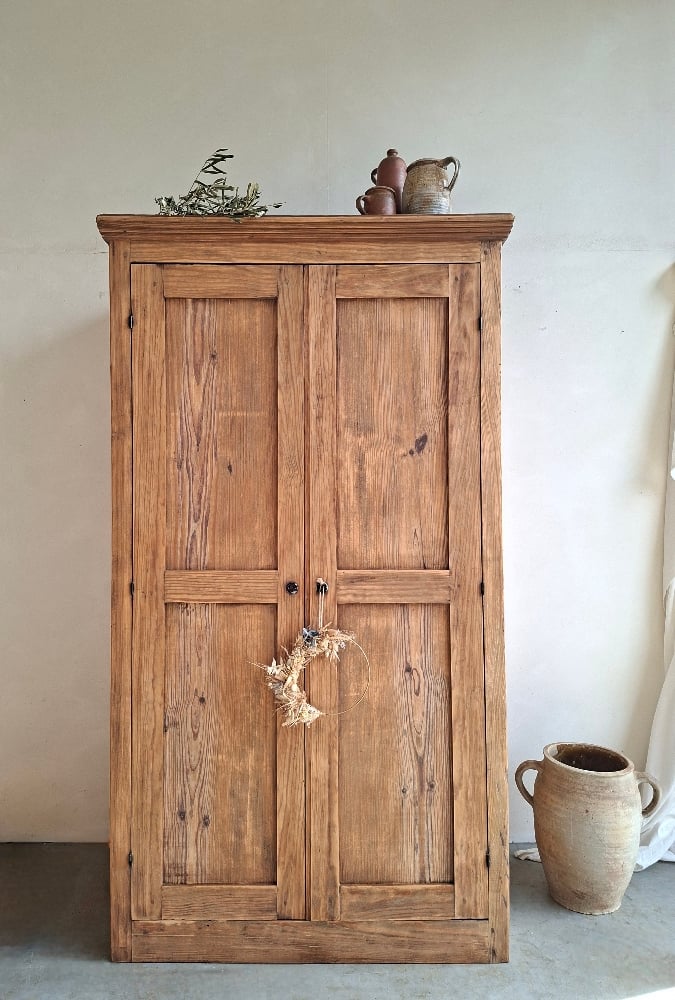 Superbe armoire ancienne en bois massif, au charme brut et intemporel. Son bois de pin patiné, aux veines apparentes et aux nuances naturelles, raconte une histoire et s’intègre aussi bien dans un intérieur campagne chic, maison de famille, bord de mer ou wabi-sabi.